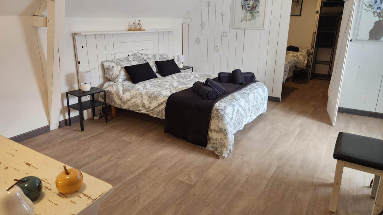 Our spacious gîte features a cozy and versatile layout, with an open-plan upstairs sleeping area for up to 4 guests and a comfortable sofa bed in the downstairs living room 2 guests, accommodating up to 6 guests in total—perfect for families, couples, or small groups. We are also able to put extra beds in the upstairs open plan main bedroom area on request and for a further cost. Please ask for details.